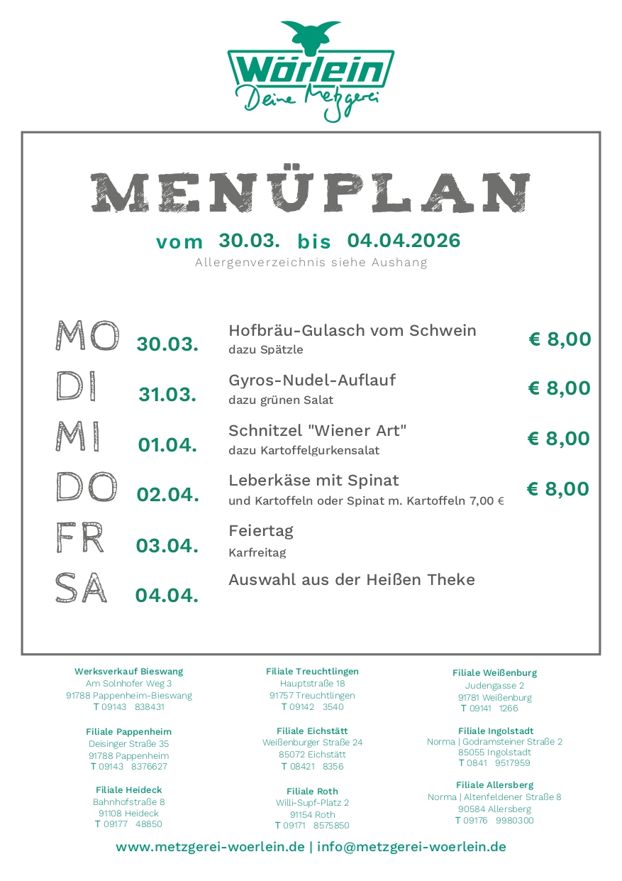 Du kannst Dir aber auch die Produkte bequem nach Hause liefern lassen. Bestell einfach in unserer Online-Filiale: www.metzgerei-woerlein.de/webshop